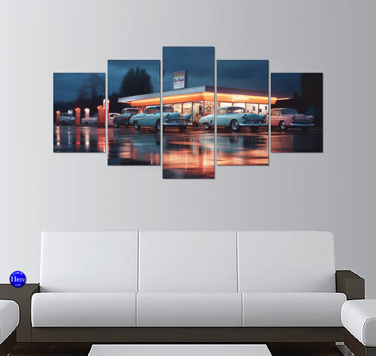 1950s Retro Diner at Twilight with Classic Cars – 5 Panel Canvas Print Wall Art