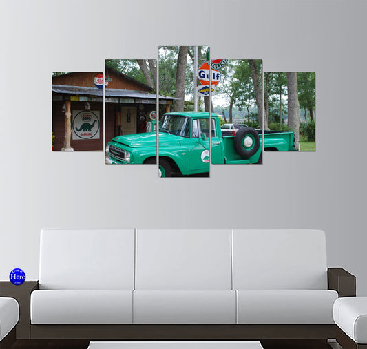 Classic Green Pickup at Sinclair Gas Station 5 Panel Canvas Print Wall Art
