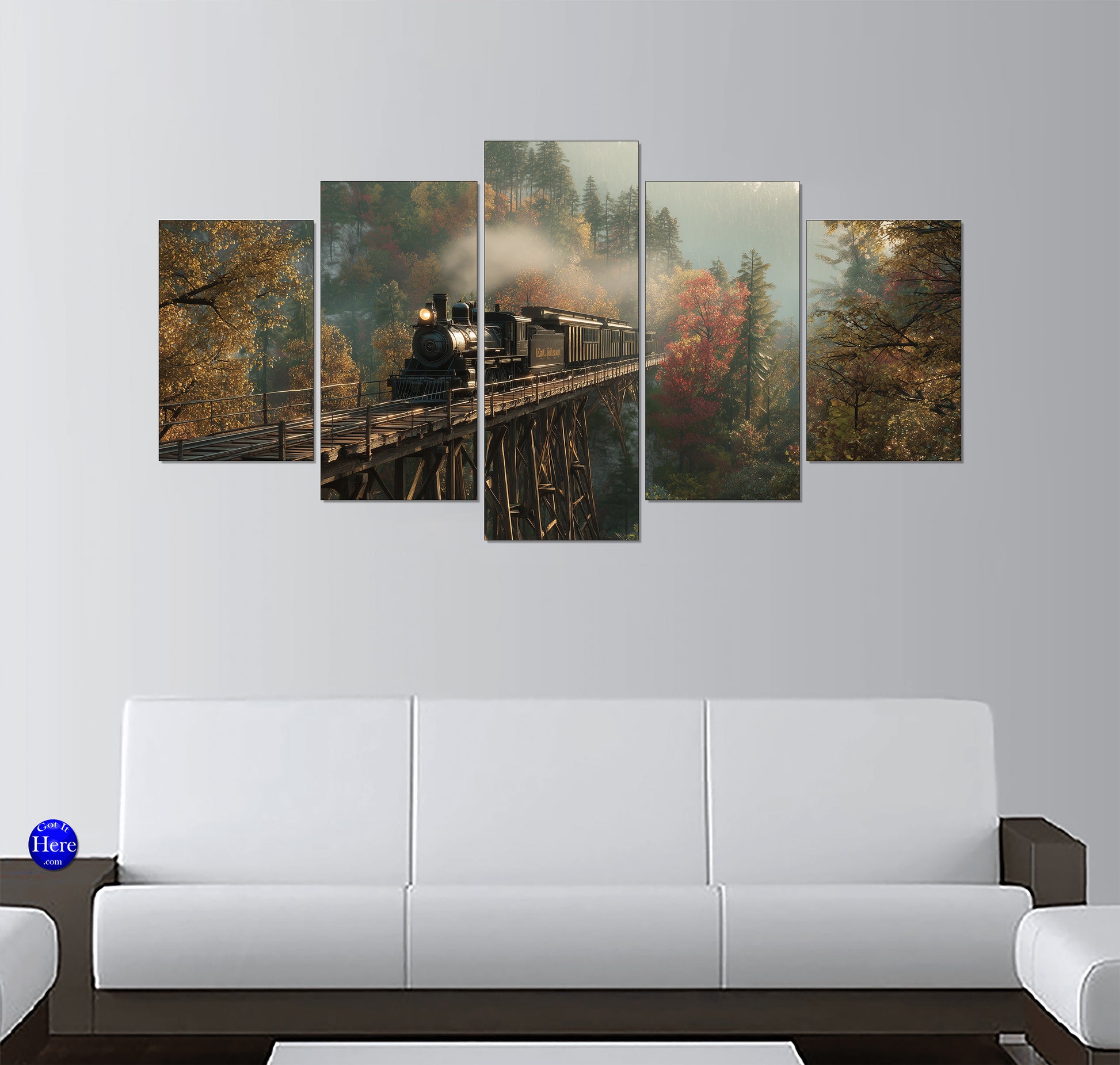 A vintage locomotive crosses a trestle bridge deep in the forest, surrounded by the warm hues of autumn. Rich amber and sienna leaves carpet the hillside, and morning mist rises from the riverbed below. The scene is composed with cinematic symmetry, highlighting the bold motion of the train as it contrasts against the softness of the natural surroundings. It evokes both seasonal change and timeless travel.